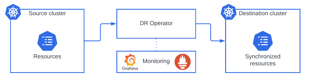 The Disaster Recovery Operator extracts the resources from the source cluster and syncs them on the destination cluster maintaining a consistent state between them.